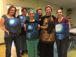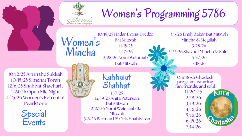 Our congregation values special opportunities for women to gather and connect spirituality through experiences with learning, prayer, song, and art. A lay-led Rosh Chodesh group, Open Mic nights, all-women Kabbalat Shabbat and Shabbat Mincha tefillot, and our signature Sukkot Art event, highlight a calendar of fulfilling women’s programming. See below for this year’s calendar: